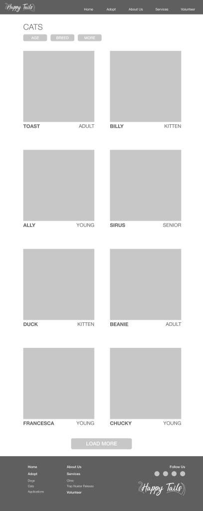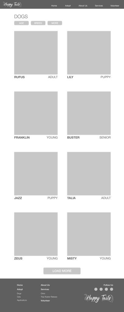 I created a low-fidelity prototype that included a home page, about us, adoptable dogs and cats, application form, volunteer pages, and more.